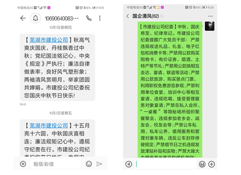 發(fā)送廉政短信。中秋國(guó)慶前期和期間,公司紀(jì)委向全體干部員工及控股企業(yè)領(lǐng)導(dǎo)班子成員累計(jì)發(fā)送廉政短信348條次,通過(guò)企業(yè)微信群累計(jì)發(fā)送廉政提醒14次,在表達(dá)節(jié)日祝福的同時(shí),提醒廣大領(lǐng)導(dǎo)干部嚴(yán)格遵守廉潔自律各項(xiàng)規(guī)定,繃緊廉潔自律這根弦,筑牢拒腐防變這道防線。